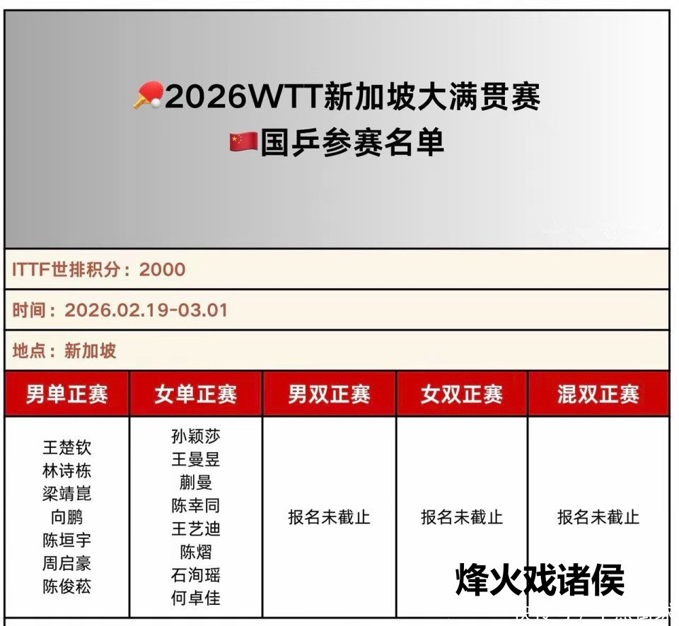 2026年新加坡大满贯赛将于2月19日至3月1日在新加坡体育中心举行,这是新年首站2000分顶级赛事,国乒这次派出了一支由15东谈主构成的豪华威望,男单7东谈主,女单8东谈主,男片面,王楚钦和林诗栋将当作前二种子参赛;女片面,孙颖莎和王曼昱也将当作前二种子出战,外协会敌手中,张本智和等老敌手展望将系数登场,关于国乒而言,这次赛事不仅是对主力球员情状的考研,更是对重生代球员的实战锻真金不怕火